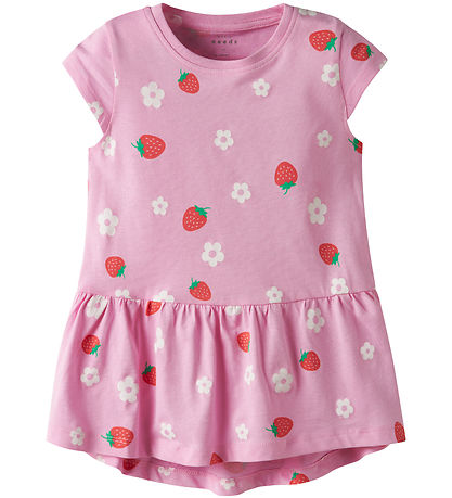 Charming Name It dress with short sleeves in a nice, pink shade. The Dress has a fine print with strawberry and flowers, which gives a fresh and playful look. Perfect for the summer season.