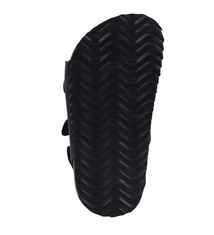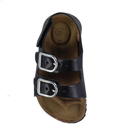 The Name It sandals have two straps across the foot that close with silver-colored metal buckles and a Velcro strap at the heel. The sole is shaped to the foot, so they have a really good fit that supports the foot. The sole consists of cork, and under the bottom there is a layer of black foam with a grooved pattern, which ensures a secure foothold.