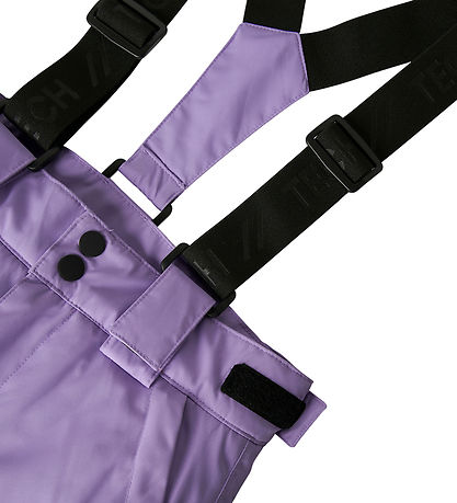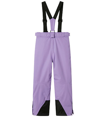 The Name It ski pants have adjustable elastic straps that gather at the back. The straps are Fast with velcro, so they can be removed if desired. The waist can be tightened with velcro on the outside, and they open with push buttons and a zipper. There are zippered pockets on the sides.