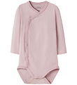 Nice Name It wrap bodysuit in dusty pink. It has long sleeves and a practical asymmetrical button closure that runs from the shoulder down to the bottom. The Name It wrap bodysuit has soft edges at the sleeves, which gives a simple look. The button closure makes it easy to open and close the bodysuit at the bottom for easy dressing.