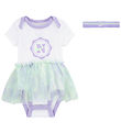 The Bodysuit is off white with green edges and a large green logo print on the front. The Bodysuit has a round neckline with practical folded shoulders and short sleeves. It closes with push buttons between the legs.