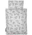 Fine Smallstuff doll bedding bedding in grey, with flowers in white and grey shades all over.