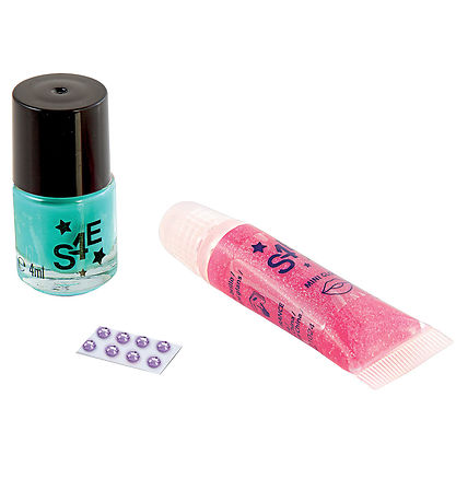 Sweet Style 4 Ever set consisting of a blue nail polish, a pink lip gloss and pretty rhinestone in purple.