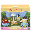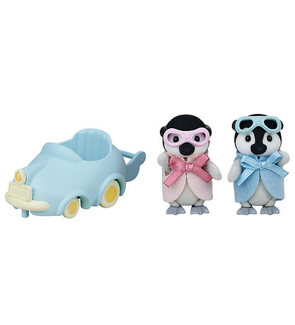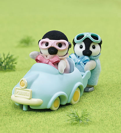 Cute Sylvanian Families toy figurine in the form of two baby penguins in fine clothes. A cool, little, light blue car is included, which they can push each other on, as well as a pair of smart driving glasses for each.