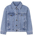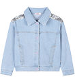Cool overshirt from The New in blue denim and with details in a lighter blue tone, including a "peace" hand sign on the open chest pocket. On the back is the same hand sign along with the text "Make your dreams come true!". The overshirt has a continuous closure at the front with buttons, and the sleeves end with a slit and button closure.
