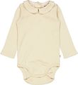 The Wheat bodysuit has long sleeves and fine details such as small ruffles at the wrists and lace edging at the neck, which gives an elegant look. It has a practical closure with push buttons over the left shoulder and between the legs.