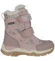 Cute Wheat winter boots in pink leather and textile with a floral print in pink and green shades. The Winter boots have a layer in purple rubber at the heel and toe, which protects against wear.