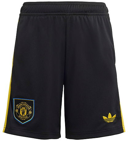 Stylish adidas Originals shorts in a deep black shade with smart yellow details on the sides. The Shorts are adorned with a visible Manchester United logo on one leg and the adidas Originals logo on the other. The adidas Originals shorts have an elastic waist with internal laces, ensuring a suitable fit.