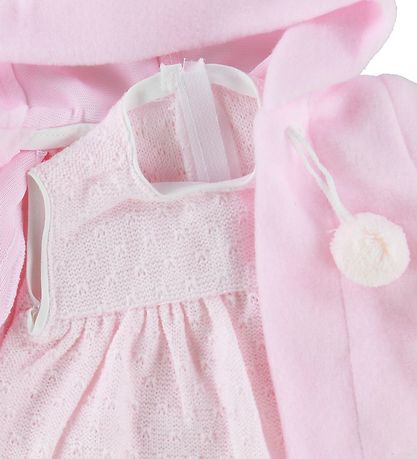 The Asi dress is sleeveless and is in rose knit. The dress opens with velcro on the back. The hat is in rose knit and on top of the hat there are two pompoms in rose. The jacket is rose with pompoms. The doll jacket has an attached hood. Along with the jacket, dress and hat included, there is also rose lining.