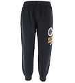 Nice Dolce & Gabbana sweatpants in navy, and at the top of the left pant leg there is a round brand in navy and white, and underneath it says "Dolce & Gabbana Est. 2021" embroidered in yellow and white letters.