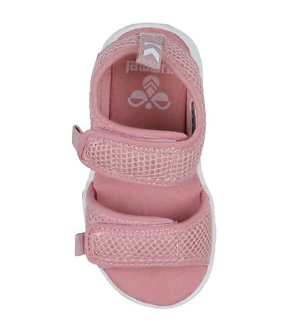 Adorable Hummel sandals in pink textile, with the brand's name and logo printed in white on the outside. On the heel are the well-known shevrons and the sandals have lights that flash on the outside when the kid walks.