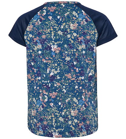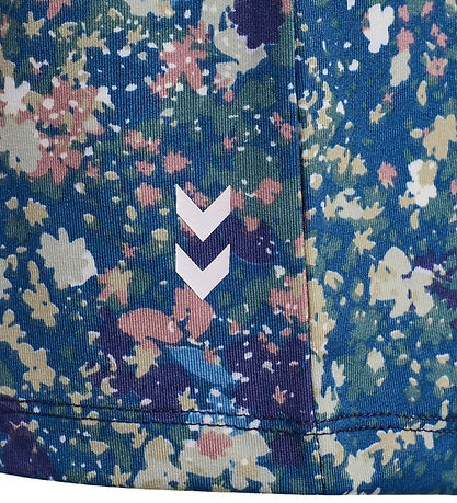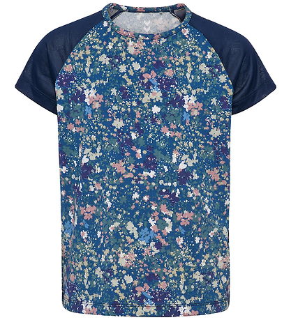 Elegant Hummel t-shirt with a beautiful floral pattern in shades of blue, pink and white. The T-shirt from Hummel has short sleeves and a round neckline. The sleeves are solid in a dark blue shade that complements the patterned design.