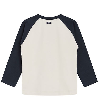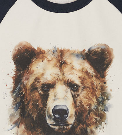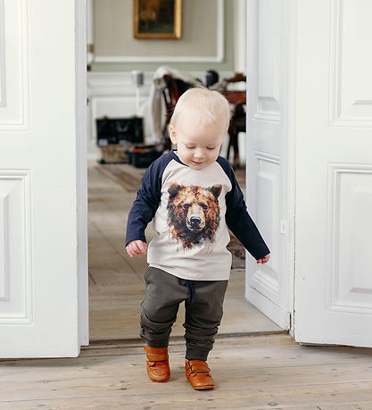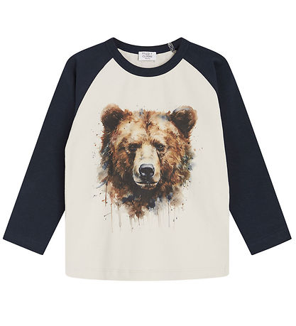 Cool Hust and Claire blouse in melange beige with dark blue sleeves and a nice, photorealistic print of a bear on the front. The print gives the blouse an adventurous and raw look that the kids will love.