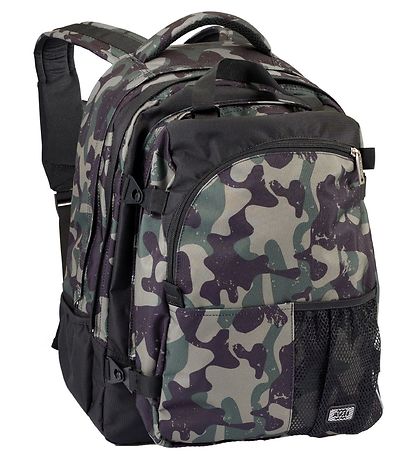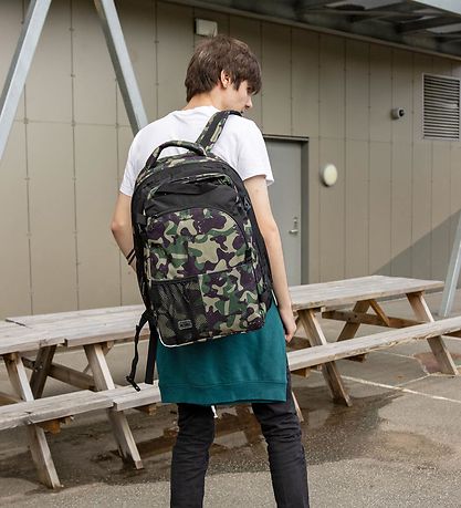 Cool Jeva school backpack with a camouflage print in green and black shades with black details.