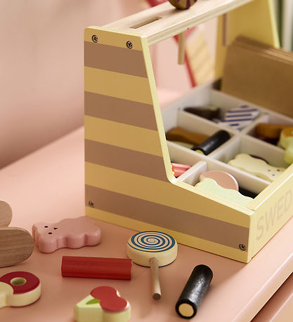 The Kids Concept candy shop consists of a wooden box with 6 Rum, and comes with a lot of different lovely wood candy, so you can play by mixing a candy bag with all your favorite candy.