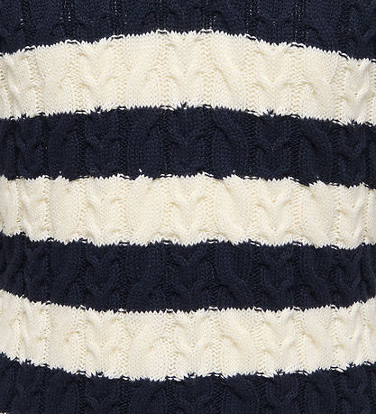 Smart blouse from Kids Only in striped white and navy blue in a nice cable knit. The Blouse has a V-neck and long sleeves. It has wide ribbed edges at the throat and sleeve openings, and a narrow ribbed edge at the bottom.