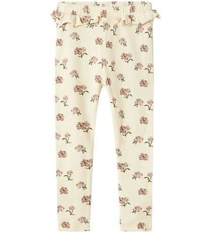 Lovely Lil' Atelier leggings in a cream white colour with a ribbed structure and a cute floral pattern. The Leggings have a nice ruffle at the waist that adds a charming element to the simple design.