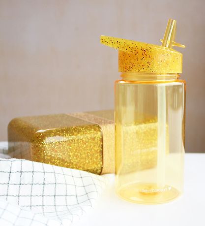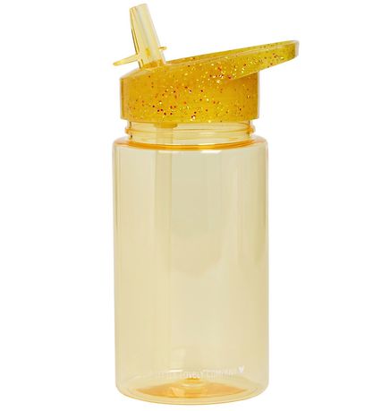 Nice A Little Lovely Company water bottle in yellow transparent plastic with a lid with gold and pink glitter.
