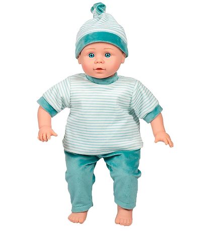 Cute MaMaMeMo doll Oscar, with a white T-shirt with green stripes and trousers in green velvet and a white beanie, with green stripes.