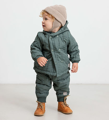 Beautiful MarMar baby hat in a simple beige shade in a knitted quality with a ribbed structure. The baby hat has a round head shape and a wide edge with a fold. On the sides there are ear flaps that protect the ears well, and the baby hat closes under the chin with a knitted strap with a little button.