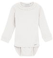 Charming Minymo bodysuit with long sleeves in white with small red hearts all over and with a nice ribbed structure. The Bodysuit has cute ruffles on the shoulders, which adds a nice aspect. Minymo has designed the bodysuit with push buttons between the legs, and it can be opened with hidden push buttons at both shoulders.