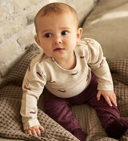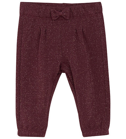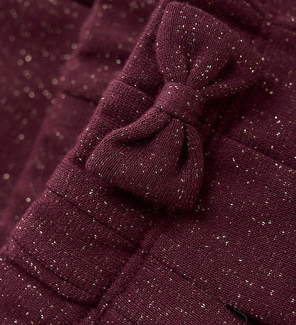 Beautiful Minymo trousers in a dark bordeaux colour with fine glitter details that give an elegant look. The Trousers have a decorative bow in the front which adds a cute touch. They have elastic at the waist for a comfortable fit and narrow ribbed edges at the ankles, which ensure that the trousers fit well.