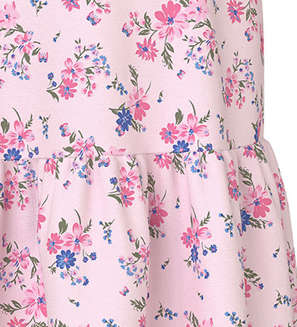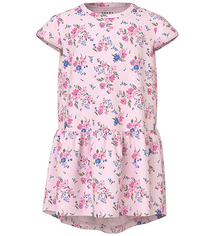 Beautiful Name It dress in pink with floral print in pink, blue and green. The Name It dress has very short sleeves and a round neckline. The Dress is cut at the hip, where there are fine wrinkles.
