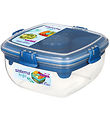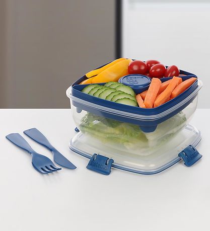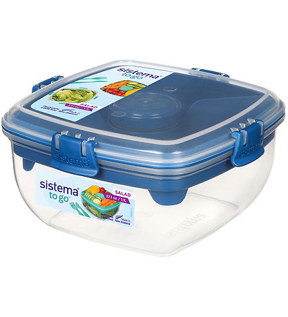Delicious Sistema lunchbox in ready plastic with dark blue details. The Lunchbox has a maximum capacity of 1.1 L and comes with both a set of dark blue plastic cutlery in the form of a knife and fork as well as a little, round container with a lid. The container has a maximum capacity of 35 mL.
