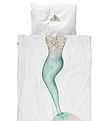 Snurk bedding is in an adult model and consists of a duvet cover and pillow cover. The duvet cover closes with a hidden zipper at the bottom, and the pillow case has a smart folding closure.