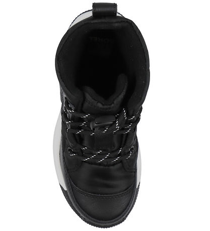 Stylish Sorel winter boots in black leather and textile with a white logo on the outside and on the heel.
