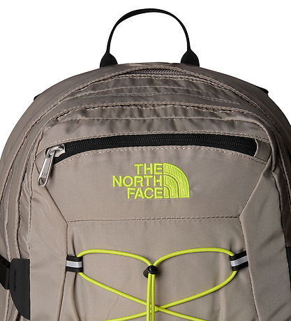 Smart The North Face backpack in grey with black and yellow details, and with an embroidered The North Face logo on the top of the backpack.