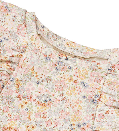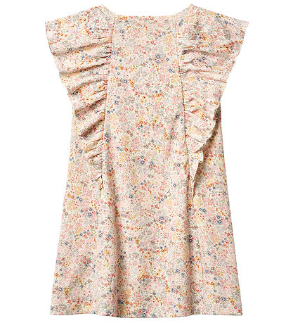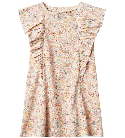 Beautiful Wheat Dress with short sleeves in a light rose with a delicate floral print. The Dress has decorative ruffles along the sides and adds a simple but charming look to any outfit.