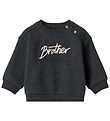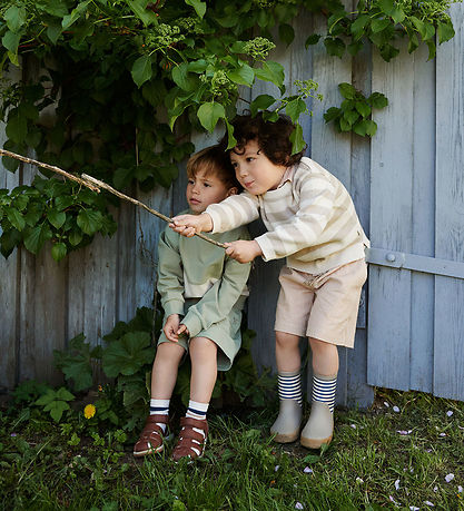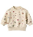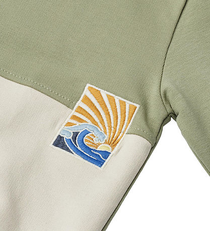 Elegant Wheat sweatshirt in a combination of green and cream shades. The Wheat sweatshirt has ribbed edges at the throat, sleeves and waist, and an embroidered, colorful wave motif on the left side.