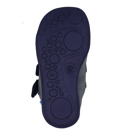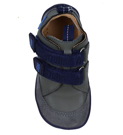 Practical Affenzahn shoe in grey leather with dark blue details. The shoes have an Affenzahn logo on the outside and a bear on the Velcro straps.