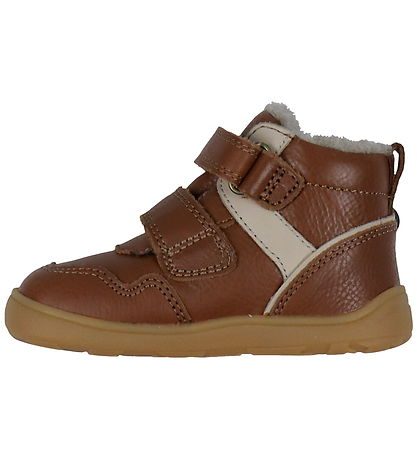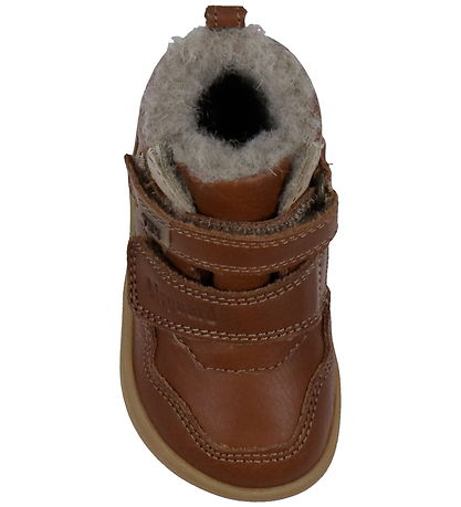 Stylish Bisgaard winter boots in brown leather with light beige details. The Winter boots have a logo embossed into the leather on one velcro strap.