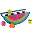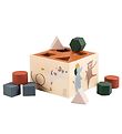 The Djeco shape sorter has a square shape with holes with geometric shapes, so the child can place a suitably-shaped brick in the holes. The top can be tilted up so that it is easy to grab the bricks again.
