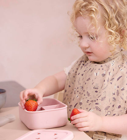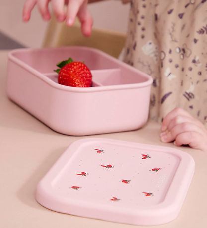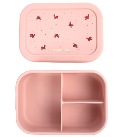 Beautiful Filibabba lunchbox in pink silicone with a print of ladybugs on the lid. The Lunchbox has a capacity of 700 mL.