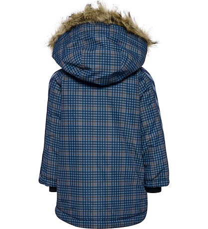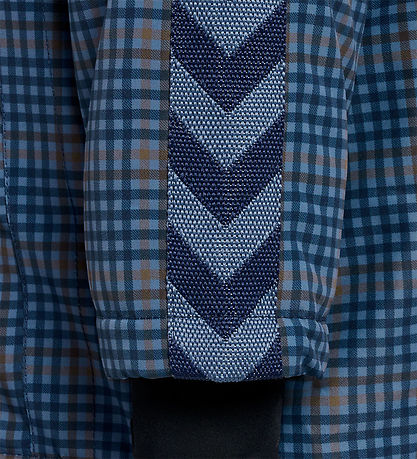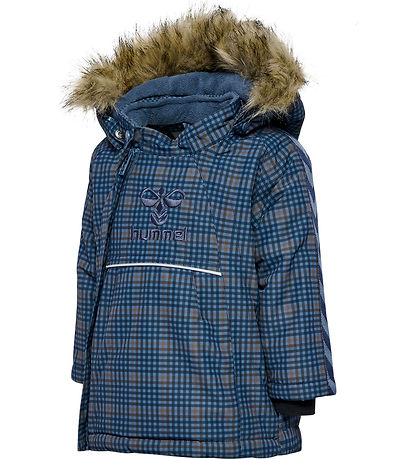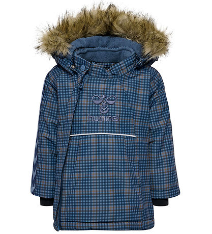 Smart Hummel winter coat in blue with checs in dark blue and brown shades. On the chest there is a large embroidered Hummel bee in blue. Along the top of the sleeves are the classic Hummel shevrons in blue and dark blue. On the front and on the left side there are reflective details.