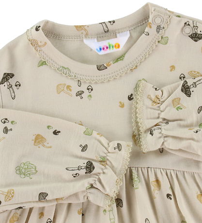 Sweet Joha dress in beige wool with a fine print of mushrooms in shades of brown, green and yellow.