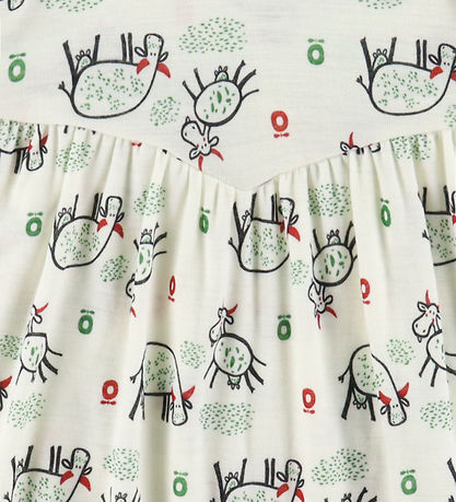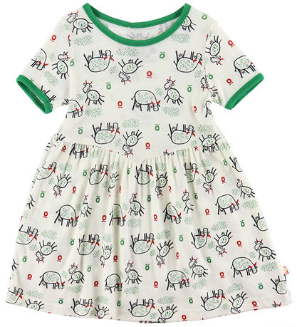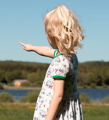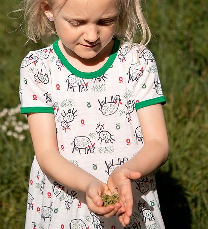 Beautiful Katvig dress in white with a print of cows and logos in green and red. The Dress has a round neckline and short sleeves with green edges. It has a wide skirt, which provides freedom of movement and comfort. The Dress is made of organic wool.