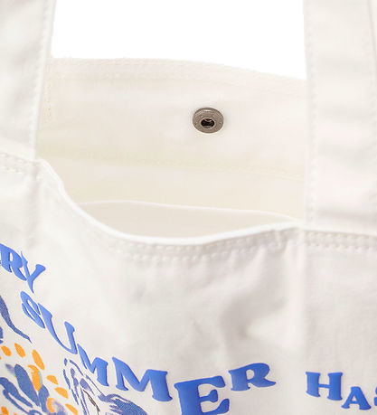 Beautiful Lala Berlin shopper in white, and on one side there is a large print in blue with orange details of flowers, lions and animal prints. Underneath is "Lala Berlin" printed in large, blue letters.