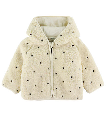 Lovely Lil' Atelier fleece jacket in soft, cream-colored teddy fleece with small brown dots shaped like hearts.
