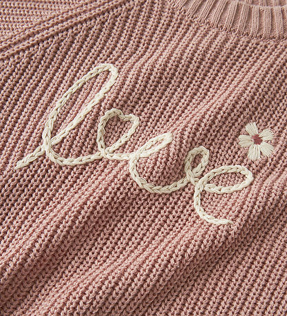 Soft Lil' Atelier blouse with ribbed structure in pink with the text "Love" and a flower in white on the front. It has a round neckline and long sleeves. The Blouse has wide ribbed edges in all openings.