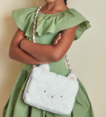 Adorable Meri Meri cute cat shaped shoulder bag in white plys with ears, embroidered face and purple trim.