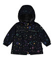 The Mikk-Line winter coat has a removable hood, which is fastened with push buttons along the collar. The hood has elastic inserts and a little brim in the face opening. The arm openings of the winter jacket have fleece-lined elastic edges.