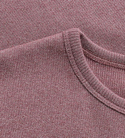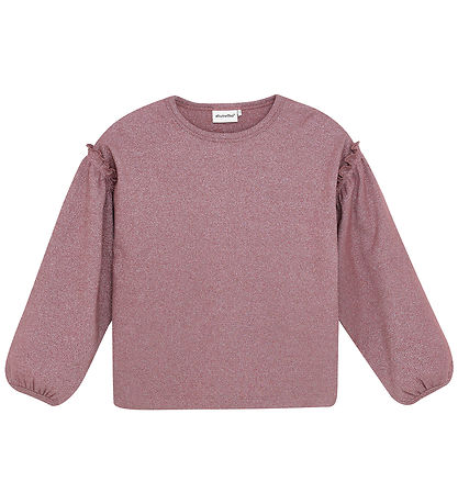 Elegant Minymo blouse in pink with glitter. The Blouse has a ribbed structure and a round neckline with push buttons at the left shoulder. It has long, wide sleeves with ruffles and gathers at the shoulders and elastic at the wrists.