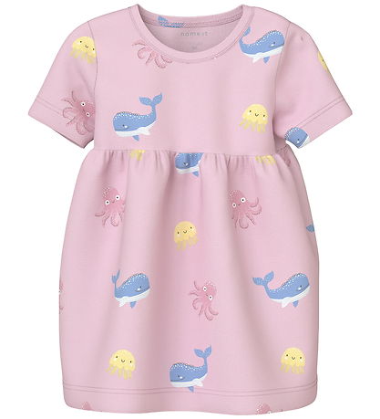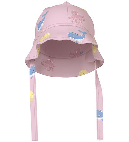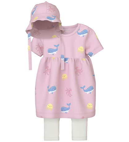 The Dress is in pink with a fun ocean print, and has short sleeves and practical push buttons at one shoulder. The Leggings are white and have a practical elastic at the waist. The Sun hat is in pink with a colorful ocean print, and has practical drawstring.