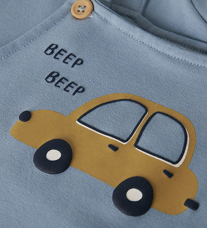Charming Name It overalls in a soft blue shade with a print on the front of a car in yellow and the text "Beep Beep".