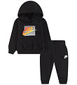 The Nike hoodie has a Fast hood and it has wide ribbed edges. In front there is a large, square kangaroo pocket. The sweatpants have long legs with wide ribbed edges, and there is a wide elastic edge at the waist. The sweat set has soft, brushed cotton on the inside.