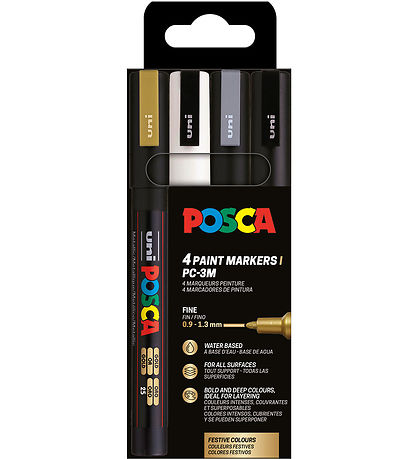 Beautiful Posca markers sold in a 4-Pack that includes a black, a white, a gold and a silver (0.9-1.3 mm).